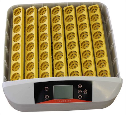 Вместительный инкубатор на 56 яиц с прозрачной верхней панелью и встроенной светодиодной подсветкой. Оснащен микрокомпьютером, который автоматически управляет всеми процессами: поддерживает необходимую температуру и влажность (при превышении заданных параметров включается тревожный сигнал), а также переворачивает яйца. Питается от сети 220 В.